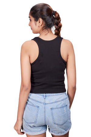 Meet your essential Racer Back Crop Top. Designed for everyday comfort, this wardrobe basic features a soft, body-hugging fit paired with a sleek racer-back silhouette. The modern crop length makes it perfect to style with high-waisted jeans, leggings, or joggers—effortlessly blending comfort with contemporary fashion. A must-have piece for seamless, everyday styling.